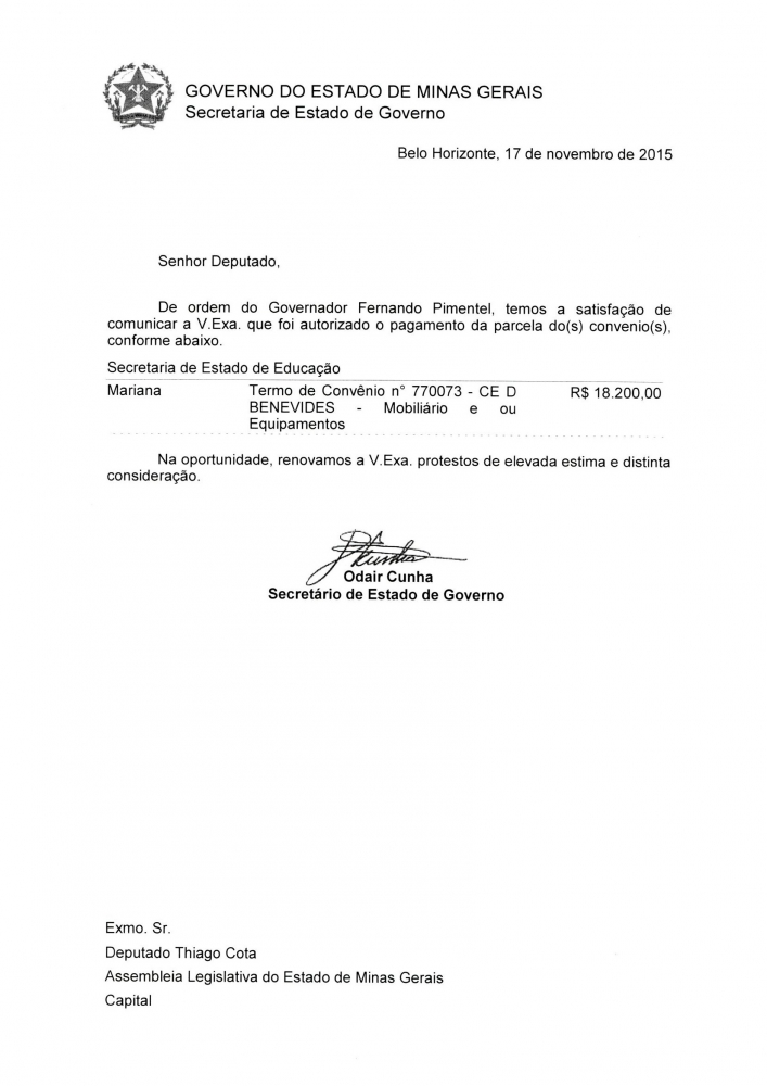 Thiago Cota viabiliza recursos para Escolas Estaduais de Mariana