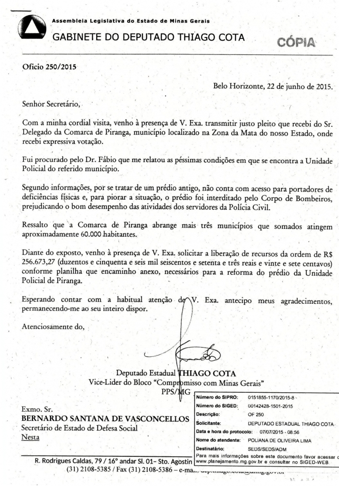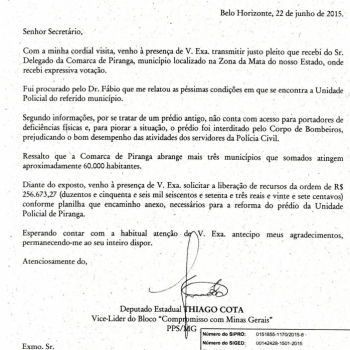 Deputado Thiago Cota solicita recursos para reforma da delegacia de Piranga
