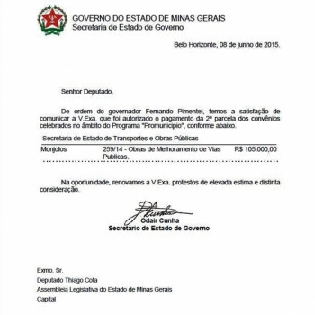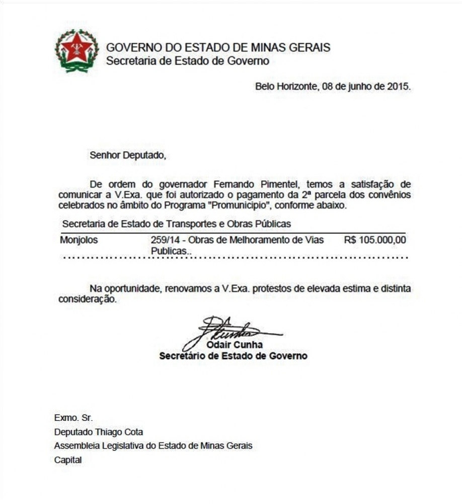 Governo confirma liberação de recursos para Couto de Magalhães de Minas